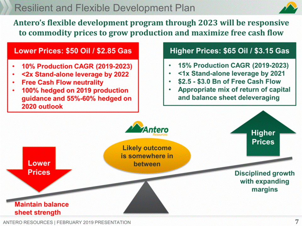 Recent Developments/Near-Term Catalysts Midstream Simplification (Expected to close in March 2019) Expected to provide AR with at least $300 million in cash depending on the cash election of public AM unitholders (subject to the approval of Antero Midstream unitholders and AMGP shareholders) AR will no longer consolidate AM beginning in 1Q 2019, but will account for New AM using the equity method, presenting better clarity for AR investors Antero Announces 2019 Capital Budget and Production Guidance (January 2019) Disciplined plan with >20% reduction in D&C capital spending relative to 2018, within cash flow(1), while targeting 17% - 20% year-over-year production growth in 2019 Long-term outlook of 10% to 15% production growth creates substantial flexibility to adjust future development plans based on commodity prices Hedge Restructuring & Deleveraging (December 2018) Generated Proceeds of $357 million to repay debt Resulting hedge portfolio protects price on 100% of 2019 and >50% of 2020 expected natural gas production at ~$3.00/MMBtu Mariner East 2 In Service (December 2018) ME2 initial phase in service on 12/29/18 (capacity to move ARs 50,000 Bbl/d commitment) ARs 11,500 Bbl/d ethane sales contract with Borealis was in service 11/1/2018 and 5,000 Bbl/d ethane contract with Ineos in service 1/1/2019 with exports out of Marcus Hook, PA on ME1 Share Repurchases (November/December 2018) Repurchased 9.1 million shares (3% of outstanding shares) at an average price of $14.10/share Approximately $470 million remaining in current $600 million share repurchase program Rover Sherwood Lateral In Service (November 2018) Enabled AR to shift ~550 MMcf/d of gas sales from Appalachian Basin pricing to premium Midwest pricing 6 Antero Resources February 2019 Presentation Stand-alone drilling and completion capital spending at approximately Stand-alone Adjusted Operating Cash Flow levels assuming $50 per barrel WTI oil and $3.00 per MMBtu NYMEX natural gas prices.