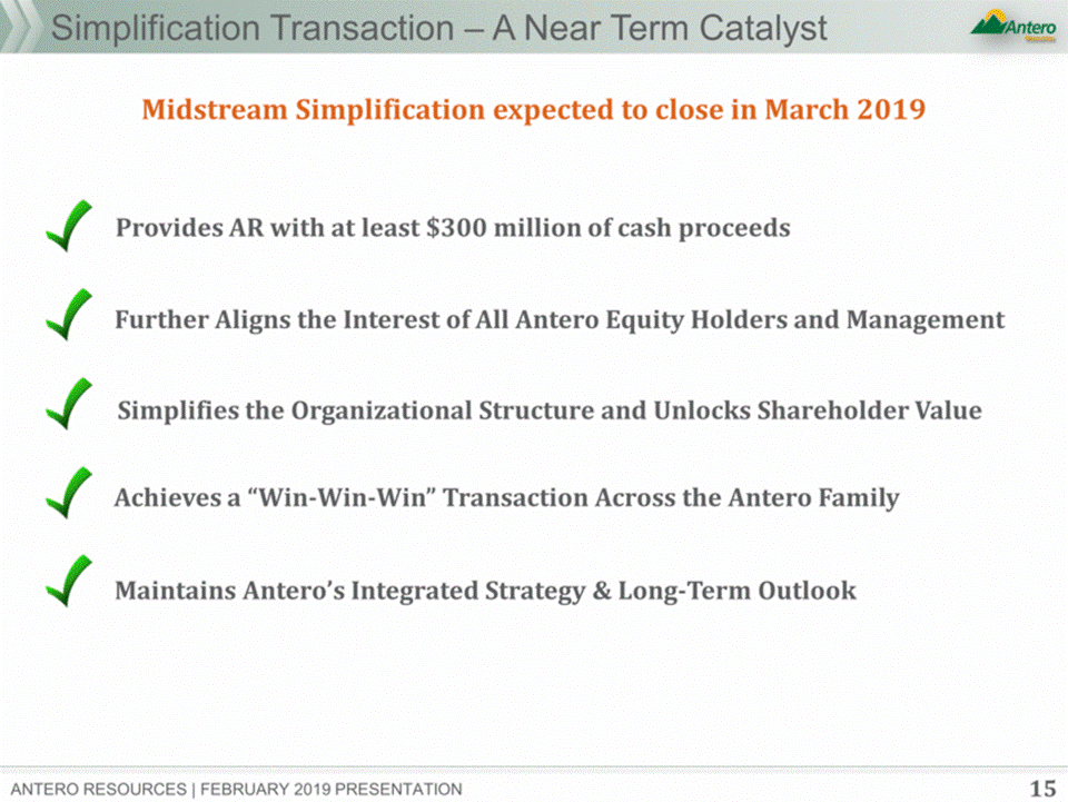 Legal Disclaimer NO OFFER OR SOLICITATION This presentation includes a discussion of a proposed business combination transaction (the Transaction) between AM and AMGP. This presentation is for informational purposes only and does not constitute an offer to sell or the solicitation of an offer to buy any securities or a solicitation of any vote or approval, in any jurisdiction, pursuant to the Transaction or otherwise, nor shall there be any sale, issuance, exchange or transfer of the securities referred to in this document in any jurisdiction in contravention of applicable law. No offer of securities shall be made except by means of a prospectus meeting the requirements of Section 10 of the Securities Act of 1933, as amended. IMPORTANT ADDITIONAL INFORMATION In connection with the Transaction, AMGP has filed with the U.S. Securities and Exchange Commission (SEC) a registration statement on Form S-4, that includes a joint proxy statement of AM and AMGP and a prospectus of AMGP. The Transaction will be submitted to AMs unitholders and AMGPs shareholders for their consideration. AM and AMGP may also file other documents with the SEC regarding the Transaction. The registration statement on Form S-4 has not been declared effective by the SEC, and the definitive joint proxy statement/prospectus has not yet been delivered to the shareholders of AMGP and unitholders of AM. This document is not a substitute for the registration statement and joint proxy statement/prospectus that has been filed with the SEC or any other documents that AMGP or AM may file with the SEC or send to shareholders of AMGP or unitholders of AM in connection with the Transaction. INVESTORS AND SECURITY HOLDERS OF ANTERO MIDSTREAM AND AMGP ARE URGED TO READ THE REGISTRATION STATEMENT AND THE JOINT PROXY STATEMENT/PROSPECTUS REGARDING THE TRANSACTION AND ALL OTHER RELEVANT DOCUMENTS THAT ARE FILED OR WILL BE FILED WITH THE SEC, AS WELL AS ANY AMENDMENTS OR SUPPLEMENTS TO THESE DOCUMENTS, CAREFULLY AND IN THEIR ENTIRETY BECAUSE THEY WILL CONTAIN IMPORTANT INFORMATION ABOUT THE TRANSACTION AND RELATED MATTERS. Investors and security holders will be able to obtain free copies of the registration statement and the joint proxy statement/prospectus (when available) and all other documents filed or that will be filed with the SEC by AMGP or AM through the website maintained by the SEC at http://www.sec.gov. Copies of documents filed with the SEC by AM will be made available free of charge on AMs website at http://investors.anteromidstream.com/investor-relations/AM, under the heading SEC Filings, or by directing a request to Investor Relations, Antero Midstream Partners LP, 1615 Wynkoop Street, Denver, Colorado 75219, Tel. No. (303) 357-7310. Copies of documents filed with the SEC by AMGP will be made available free of charge on AMGPs website at http://investors.anteromidstreamgp.com/Investor-Relations/AMGP or by directing a request to Investor Relations, Antero Midstream GP LP, 1615 Wynkoop Street, Denver, Colorado 75219, Tel. No. (303) 357-7310. PARTICIPANTS IN THE SOLICITATION AMGP, AM, AR and the directors and executive officers of AMGP and AMs respective general partners and of AR may be deemed to be participants in the solicitation of proxies in respect to the Transaction. Information regarding the directors and executive officers of AMs general partner is contained in AMs 2018 Annual Report on Form 10-K filed with the SEC on February 13, 2019, and certain of its Current Reports on Form 8-K. You can obtain a free copy of this document at the SECs website at http://www.sec.gov or by accessing AMs website at http://www.anteromidstream.com. Information regarding the executive officers and directors of AMGPs general partner is contained in AMGPs 2018 Annual Report on Form 10-K filed with the SEC on February 13, 2019 and certain of its Current Reports on Form 8-K. You can obtain a free copy of this document at the SECs website at www.sec.gov or by accessing the AMGPs website at http://www.anteromidstream.com. Information regarding the executive officers and directors of AR is contained in ARs 2018 Annual Report on Form 10-K filed with the SEC on February 13, 2019 and certain of its Current Reports on Form 8-K. You can obtain a free copy of this document at the SECs website at www.sec.gov or by accessing the AMGPs website at http:// www.anteroresources.com. Investors may obtain additional information regarding the interests of those persons and other persons who may be deemed participants in the Transaction by reading the joint proxy statement/prospectus regarding the Transaction when it becomes available. You may obtain free copies of this document as described above. 2 Antero Resources February 2019 Presentation