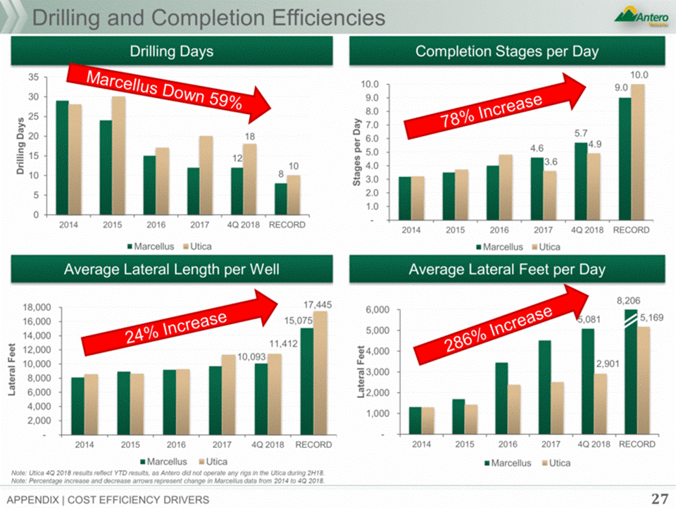 27 Drilling and Completion Efficiencies Average Lateral Feet per Day Drilling Days Average Lateral Length per Well Completion Stages per Day Appendix cost efficiency drivers 8,206 78% Increase 24% Increase 286% Increase Note: Utica 4Q 2018 results reflect YTD results, as Antero did not operate any rigs in the Utica during 2H18. Note: Percentage increase and decrease arrows represent change in Marcellus data from 2014 to 4Q 2018. Marcellus Down 59% 5,081 2,901 5,169 - 1,000 2,000 3,000 4,000 5,000 6,000 2014 2015 2016 2017 4Q 2018 RECORD Lateral Feet Marcellus Utica 10,093 15,075 11,412 17,445 - 2,000 4,000 6,000 8,000 10,000 12,000 14,000 16,000 18,000 2014 2015 2016 2017 4Q 2018 RECORD Lateral Feet Marcellus Utica 4.6 5.7 9.0 3.6 4.9 10.0 - 1.0 2.0 3.0 4.0 5.0 6.0 7.0 8.0 9.0 10.0 2014 2015 2016 2017 4Q 2018 RECORD Stages per Day Marcellus Utica 12 8 18 10 0 5 10 15 20 25 30 35 2014 2015 2016 2017 4Q 2018 RECORD Drilling Days Marcellus Utica