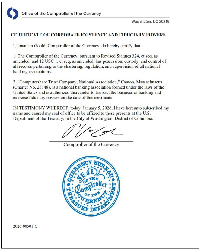 A copy of the Comptroller of the Currency Certification of Fiduciary Powers for Computershare Trust Company, National Association, dated January 5, 2026.