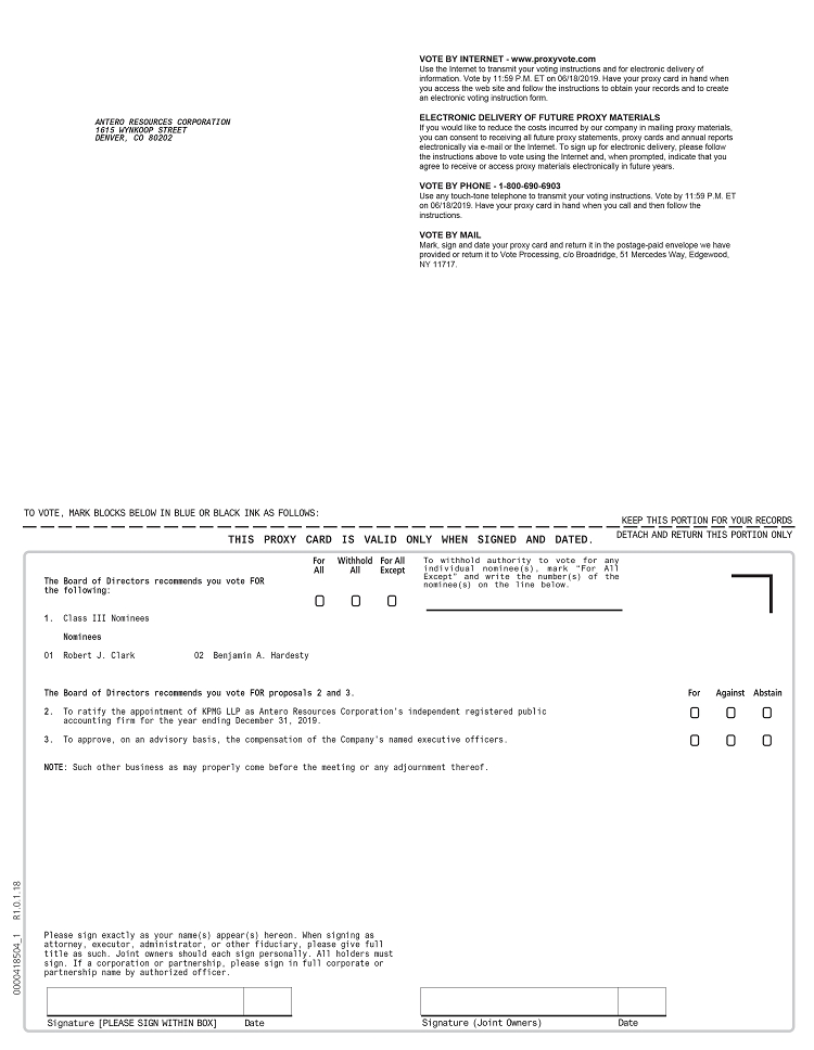 | • | FOR the ratification of the selection of KPMG LLP as Antero’s independent registered public accounting firm for the fiscal year ending December 31, 2019; and |