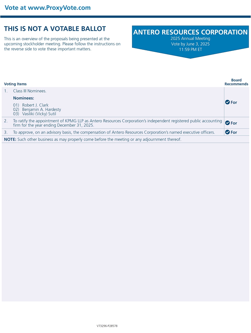 Vote at www.ProxyVote.com THIS IS NOT A VOTABLE BALLOT This is an overview of the proposals being presented at the upcoming stockholder meeting. Please follow the instructions on the reverse side to vote these important matters. ANTERO RESOURCES CORPORATION 2025 Annual Meeting Vote by June 3, 2025 11:59 PM ET Voting Items Board Recommends 1. Class III Nominees. For Nominees: 01) Robert J. Clark 02) Benjamin A. Hardesty 03) Vasiliki (Vicky) Sutil 2. To ratify the appointment of KPMG LLP as Antero Resources Corporation's independent registered public accounting firm for the year ending December 31, 2025. For 3. To approve, on an advisory basis, the compensation of Antero Resources Corporation's named executive officers. For NOTE: Such other business as may properly come before the meeting or any adjournment thereof.